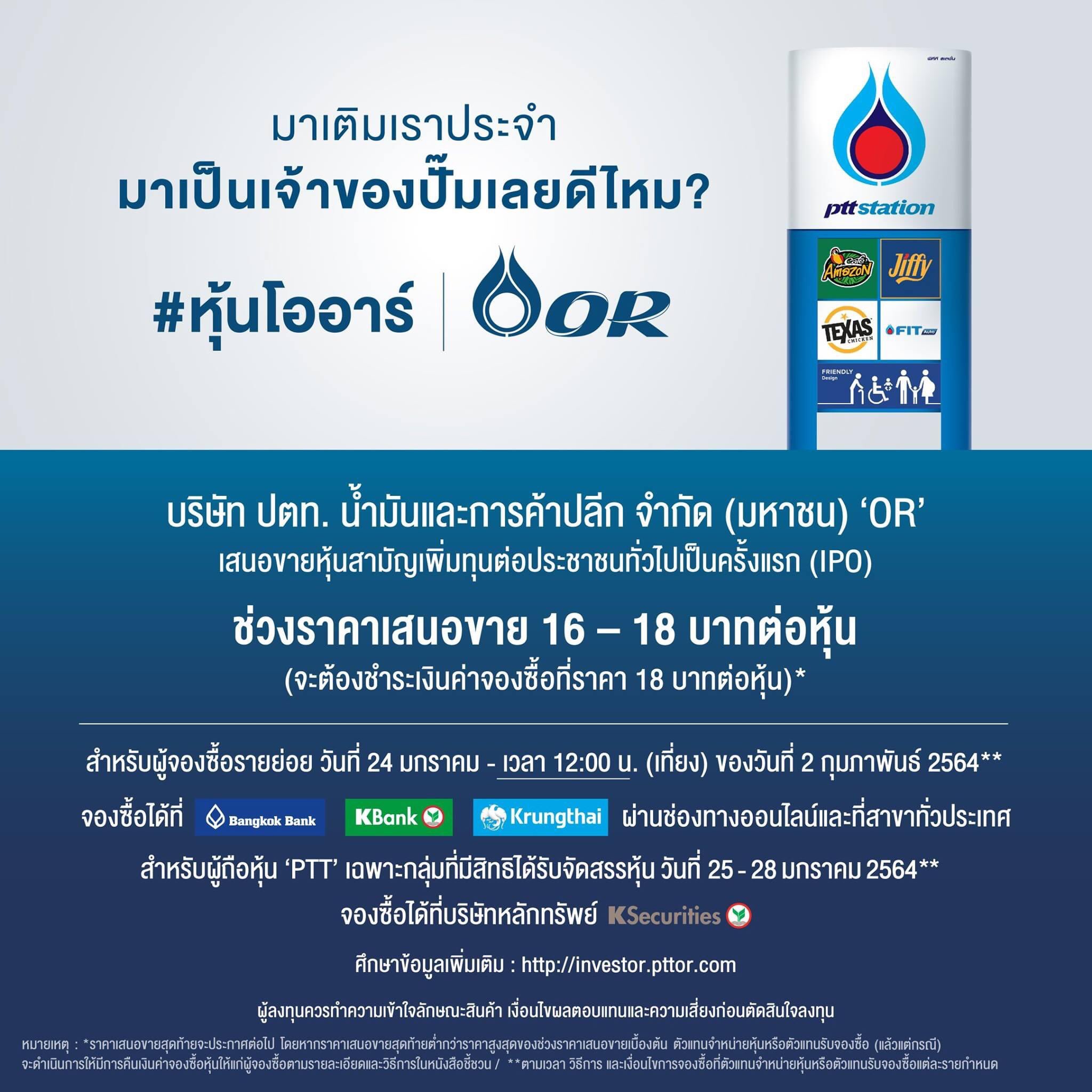 น้ำมันและการค้าปลีก จำกัด (มหาชน) หรือโออาร์ (or) ประกาศราคาเสนอขายหุ้น ipo ที่ 18 บาทต่อหุ้นและจัดสรรหุ้นเพิ่มเติมให้ผู้จองซื้อรายย่อย.